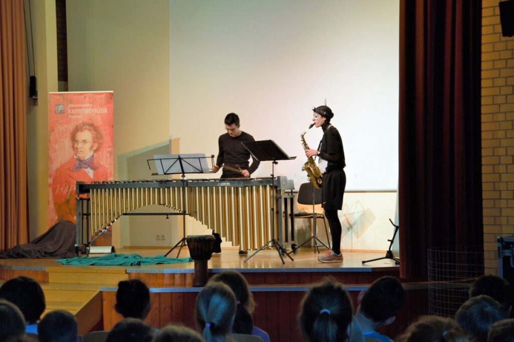 Nach ein paar „Startschwierigkeiten“, Alejandro musste sich zur Freude der Kinder zunächst kurz an der Marimba zurechtfinden, startet die musikalische Reise dann auch schon ganz im Osten. In Japan gab es leckeren Fisch und entspannende Musik. Maulis Brille aber gab es dort nicht und so wanderten die beiden schnell weiter nach Nordamerika und von dort nach Kuba. Bei südamerikanischen Klängen wippten die Kinder mit und zeigten sich begeistert von Sabina Sobrals Saxophonspiel. Das vom Landesmusikrat Brandenburg als Instrument des Jahres ausgewählte Holzblasinstrument erweist sich als vielseitig und international anwendbar. Als die Reise in Deutschland Station macht, widmen sich die beiden Musiker schließlich auch dem Hauptkomponisten des diesjährigen Kammermusikfestivals: Franz Schubert. Kurz danach ist dann auch Maulis Brille wieder aufgetaucht. Alejandro Coello Calvo, der der Marimba schon fast mystische Klänge entlockt, hat sie gefunden. Damit endet eine Musikstunde der besonderen Art, die so manchem Zuhörer Lust auf das Abschlusskonzert am 6. April in der Trinitatiskirche gemacht hat. Dort können Jung und Junggeblieben dann das Weimarer Klavierquartett in erweiterter Besetzung erleben.